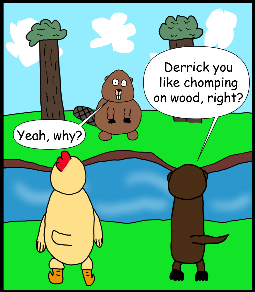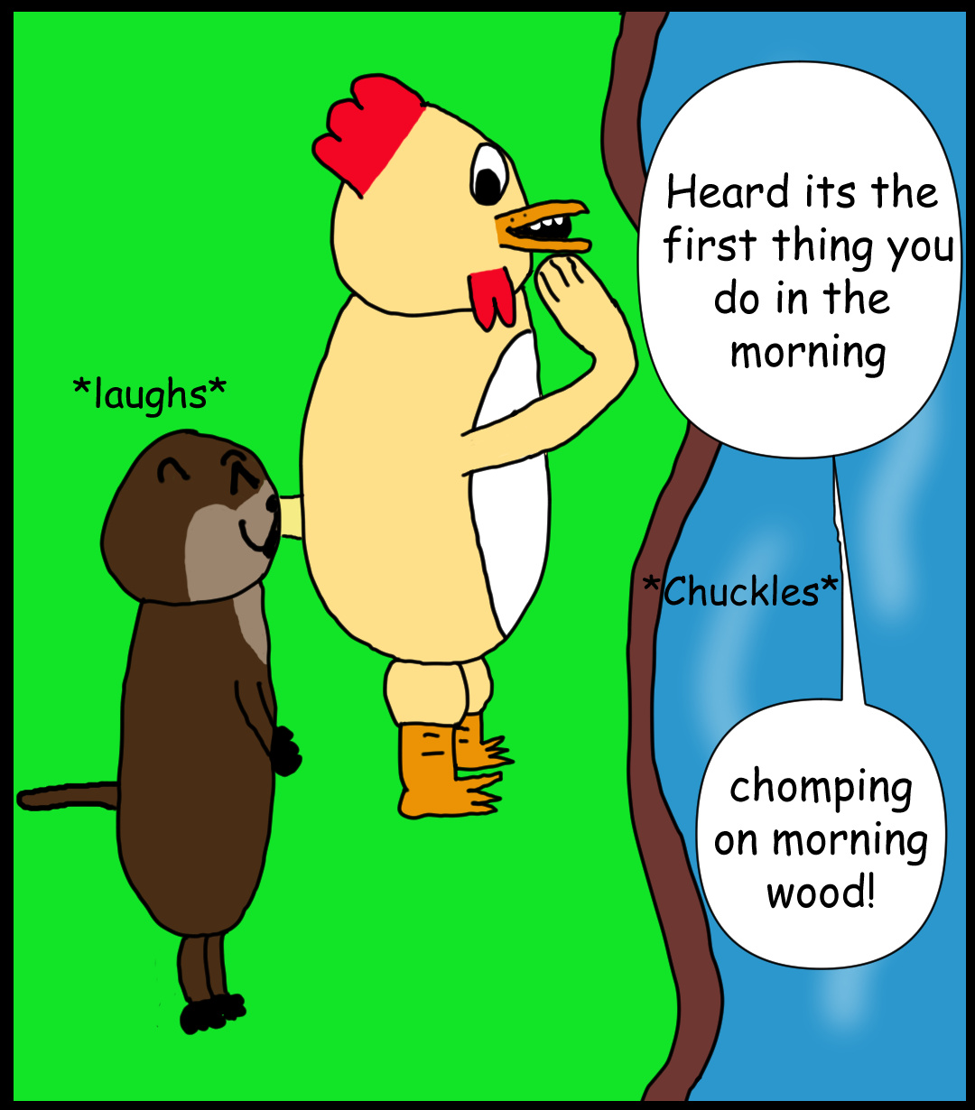 (Derrick is living the joke by chomping on wood in the morning. There is also some animal saying “cock-a-doodle-dooo” in the distance, pretty neat huh?)